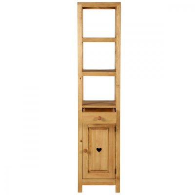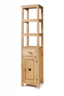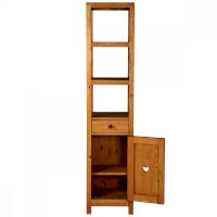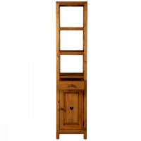 Открытый, сквозной пенал в верхней части. За дверкой одна полка. Выдвижной ящик.