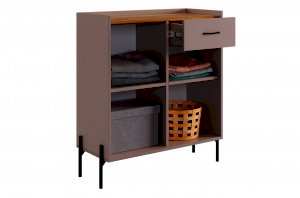 С другой стороны комод оборудован выкатным ящиком, который обеспечивает легкий доступ к часто используемым предметам. Под ним расположен большой глухой фасад, скрывающий за собой просторное хранилище для более крупных вещей.