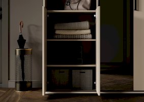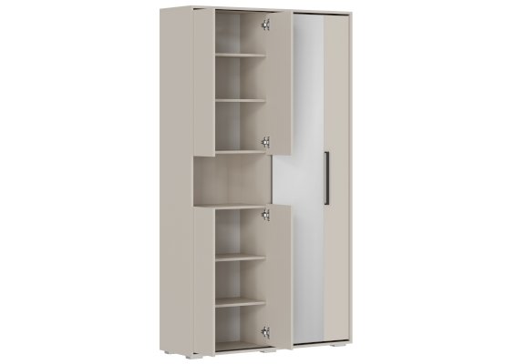 Разделение на секции: Одна часть прихожей включает две одинаковые секции с полками, закрытые створками. В каждой секции предусмотрено по две съёмные полки, что позволяет настраивать пространство под ваши нужды. Открывание створок осуществляется за выступ, что делает использование шкафа более удобным.